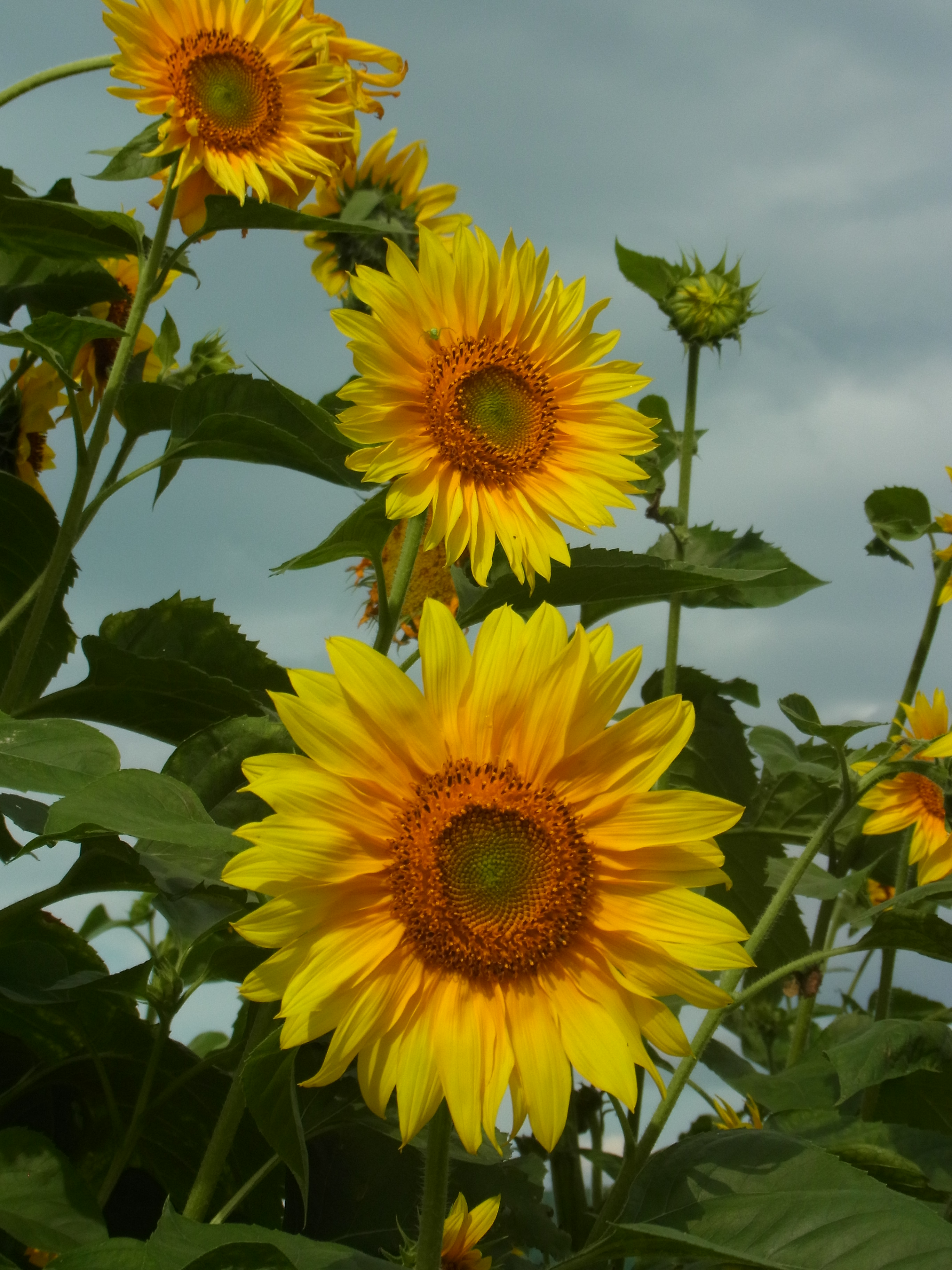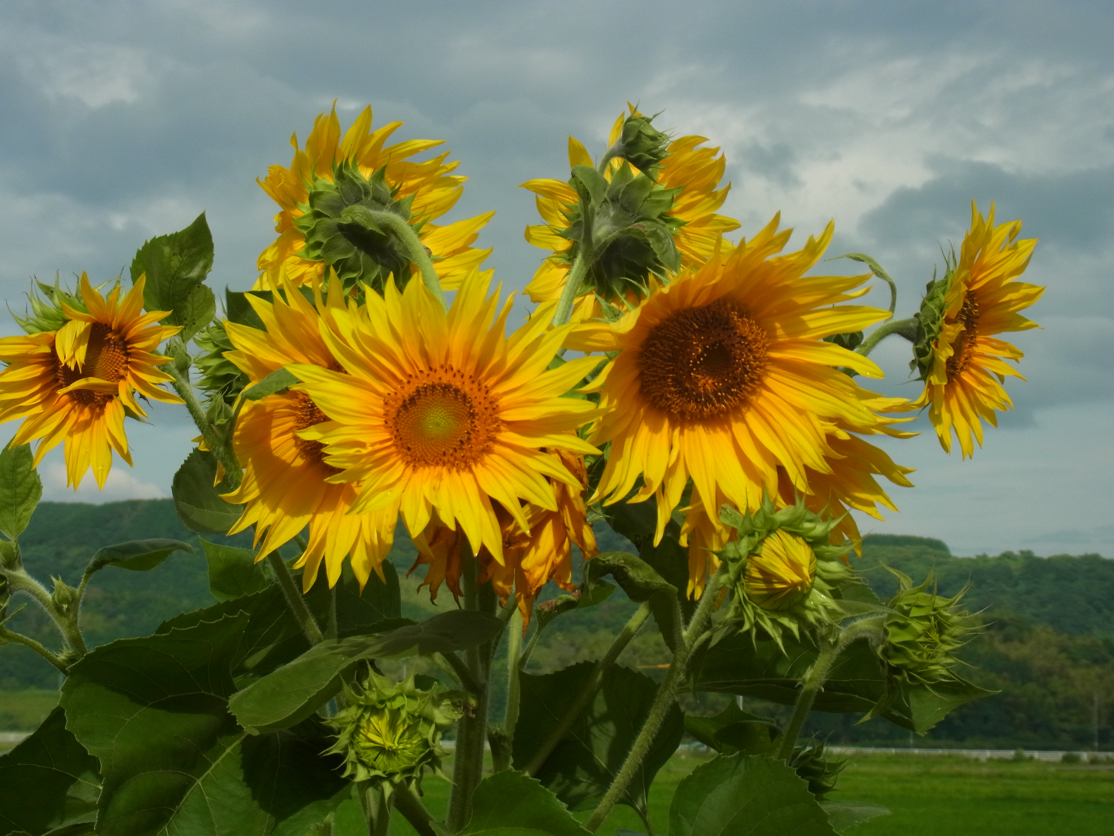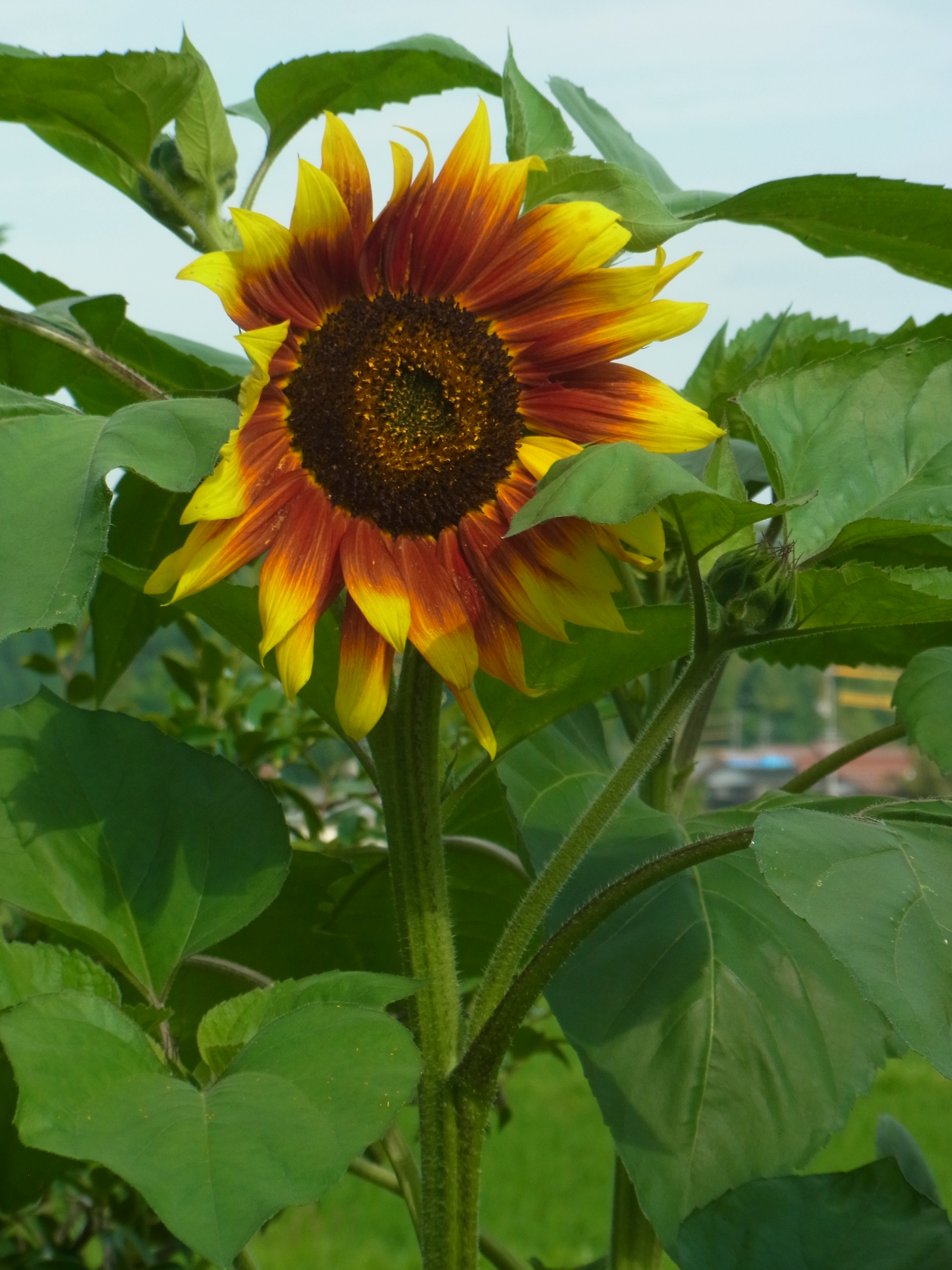 品種が異なるひまわり3~4種類を植えていたことがあり、交配して翌年以降いろんなタイプのひまわりが咲くようになりました。写真のものは分枝してたくさん花を咲かせていますが、通常の1輪咲きのものもありますし、写真のように赤い花の名残のものも咲いています。この時期になるとどこからか蜜蜂が飛んできていろいろな花の花粉を集めていて、その様子を観察するのが楽しいです。