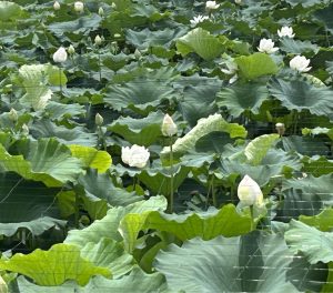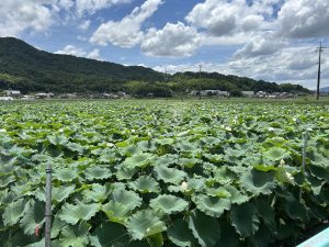 春に通った時には、水を張った田んぼに蓮根の葉が少し見えていて、今年も植え付けが始まったなあと感じる程度でしたが、