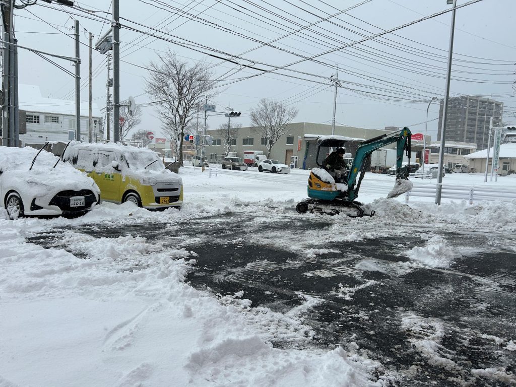 予報どおり夜から雪が降り続き、今朝はスコップでは雪かきが間に合わず、ショベルカーの登場です。