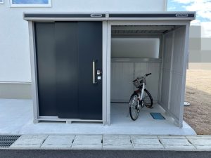 物置は物置部とオープン部のコンビタイプで、下レールがなく、ゴミ詰まり、砂詰まりの心配がありません。