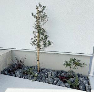 シンボルツリーはオリーブで、左側がコルディリネ、右側がマホニアコンフューサです。